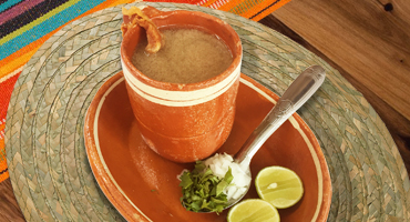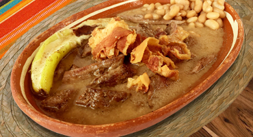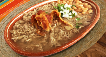 Deliciosa carne en su Jugo acompañada de frijoles de la olla, tocino, cebollitas guisadas y chile verde toreado. Receta original desde 1968.