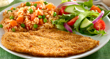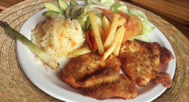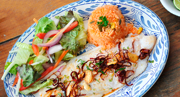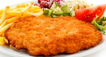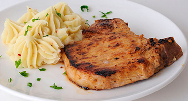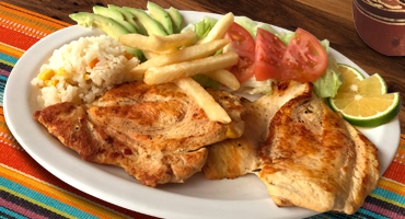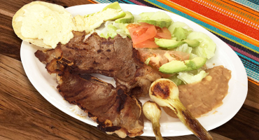 Deliciosa chuleta de res acompañada de cebollitas, tostada con queso gratinado, frijolitos y ensalada.
