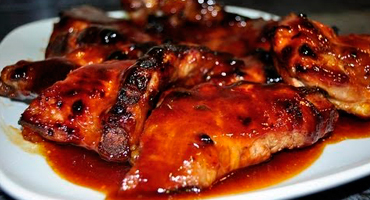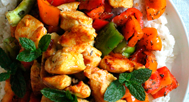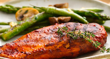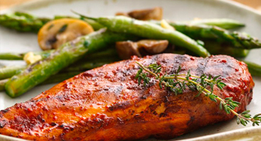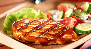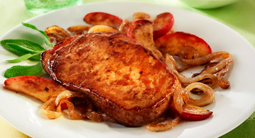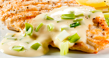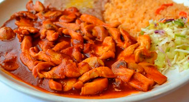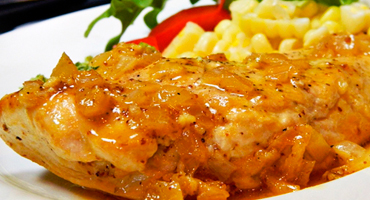 Pechuga de pollo, papa con cebolla, champiñones, queso gratinado y cubierta de salsa de manzana.