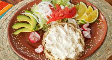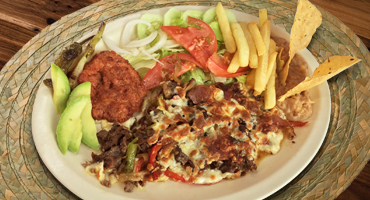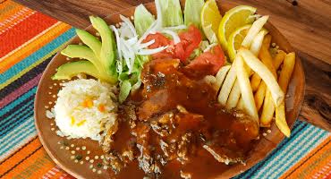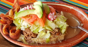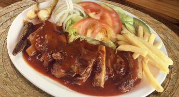 Con Bistek, tipo sope, queso gratinado, frijoles fritos y ahogada en su jugo.