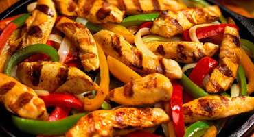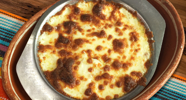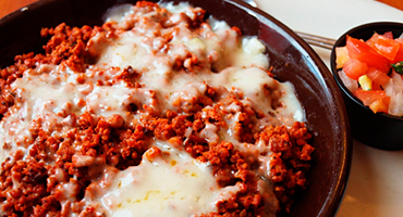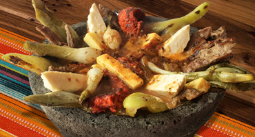 Molcajete con Arrachera, Chorizo, Salsa, Queso gratinado, Pimiento morron, Cebolla y Jitomate.