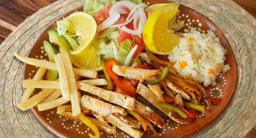 Bistek de res y cerdo, acompañado de jitomate, tocino, cebolla, chile morron, ensalada verde, frijoles de la olla y medallón de chorizo.