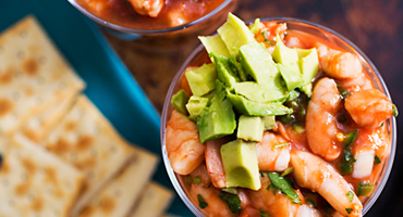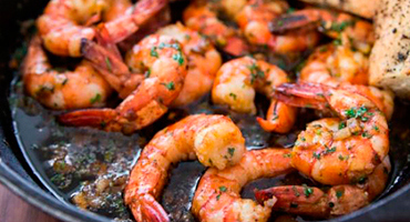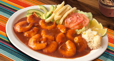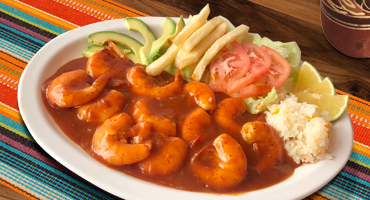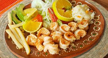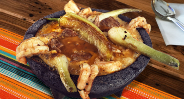 Molcajete con Camarón, Arrachera, Salsa, Queso gratinado, Pimiento morron, Cebolla y Jitomate.
